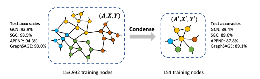 - Graph Condensation for Graph Neural Networks: In this paper, the authors aim to condense the large, original graph into a small, synthetic and highly-informative graph, such that GNNs trained on the small graph and large graph have comparable performance. They approach the condensation problem by imitating the GNN training trajectory on the original graph through the optimization of a gradient matching loss and design a strategy to condense node features and structural information simultaneously.