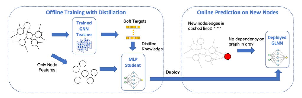 - Graph Less Neural Networks: Teaching old MLPs new tricks via Distillation: GNNs are less popular for practical deployments in the industry owing to their scalability challenges incurred by data dependency. Namely, GNN inference depends on neighbor nodes multiple hops away from the target, and fetching them burdens latency-constrained applications. In this paper, the authors bring GNNs and MLPs together via Knowledge Distillation (KD). This work shows that the performance of MLPs can be improved by large margins with GNN KD. The paper calls the distilled MLPs Graph-less Neural Networks (GLNNs) as they have no inference graph dependency.