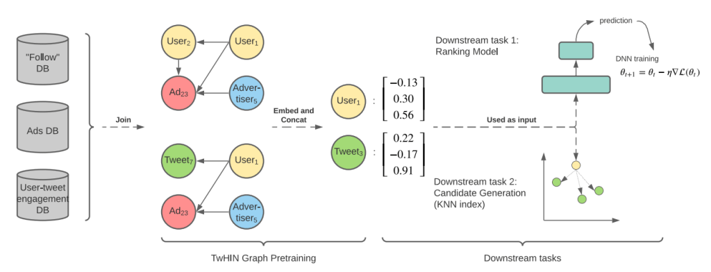 - TwHIN: Embedding the Twitter Heterogeneous Information Network for Personalized Recommendation was an interesting paper discussed as a part of the talk. The paper talks about knowledge-graph embeddings for entities in the Twitter Heterogeneous Information Network (TwHIN). The authors show that these pretrained representations yield significant offline and online improvement for a diverse range of downstream recommendation and classification tasks: personalized ads rankings, search ranking and offensive content detection.