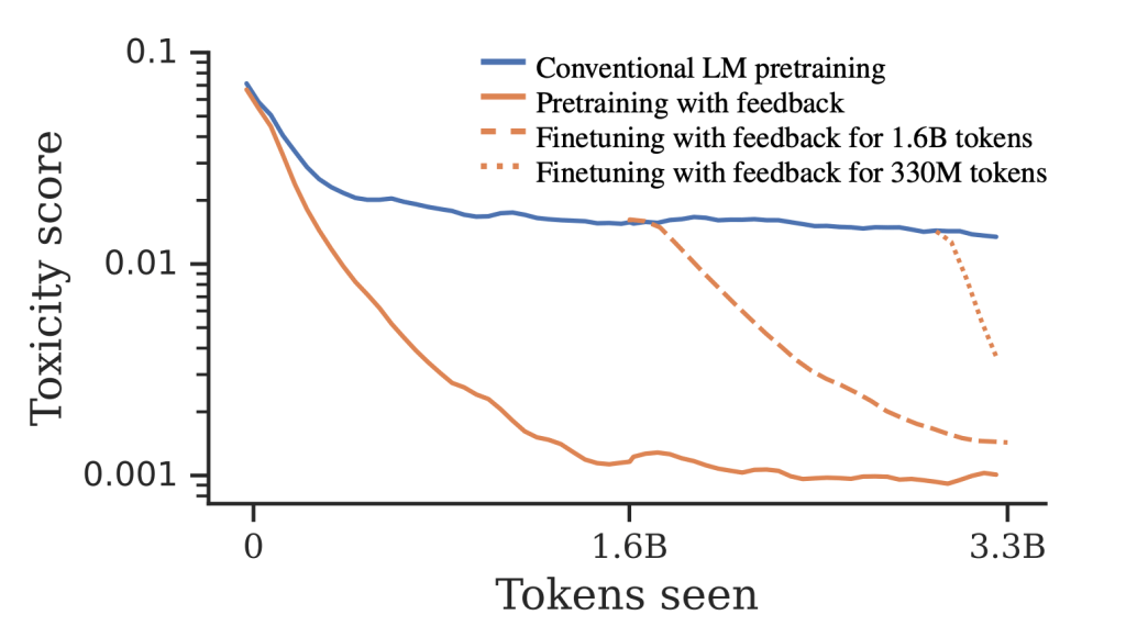 As shown in the figure above, this study suggests that incorporating human preferences from the beginning of training is better than trying to correct undesirable behavior later – Toxicity score is the lowest for the Pretraining with feedback approach.