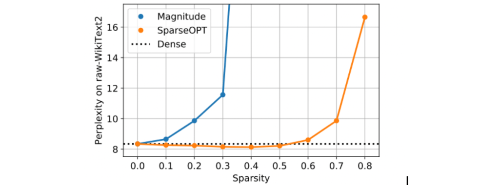 SparseGPT can induce uniform layerwise sparsity of up to 60% in e.g. the 175-billion-parameter variant of the OPT family with minor accuracy loss. By contrast, as shown in figure below, the only known one-shot baseline which easily extends to this scale, Magnitude Pruning preserves accuracy only until 10% sparsity, and completely collapses beyond 30% sparsity.