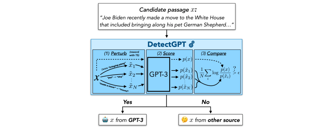 The proposed method, called DetectGPT, looks for patterns in the text that are unique to LLM-generated content. It doesn’t require training a separate detector or collecting a dataset of real and fake text. Instead, it uses the LLM’s own probabilities and random variations of the text.