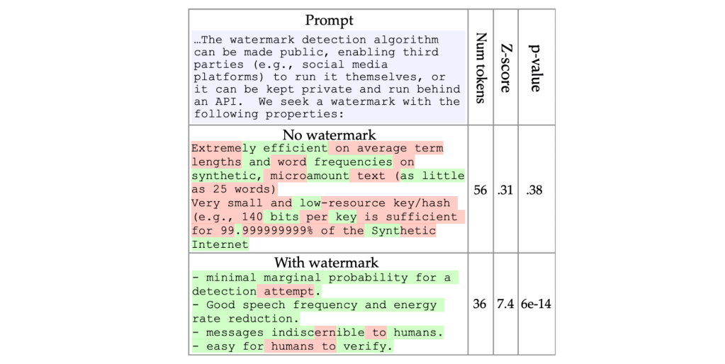 The watermark works by promoting the use of certain “green” tokens during text generation. The watermarked text, if written by a human, is expected to contain 9 “green” tokens, yet it contains 28. The probability of this happening by random chance is ≈ 6×10−14, leaving us extremely certain that this text is machine generated. The authors also introduce a statistical test to detect the watermark and analyze its effectiveness. They tested this method on a large model and discuss its robustness and security.